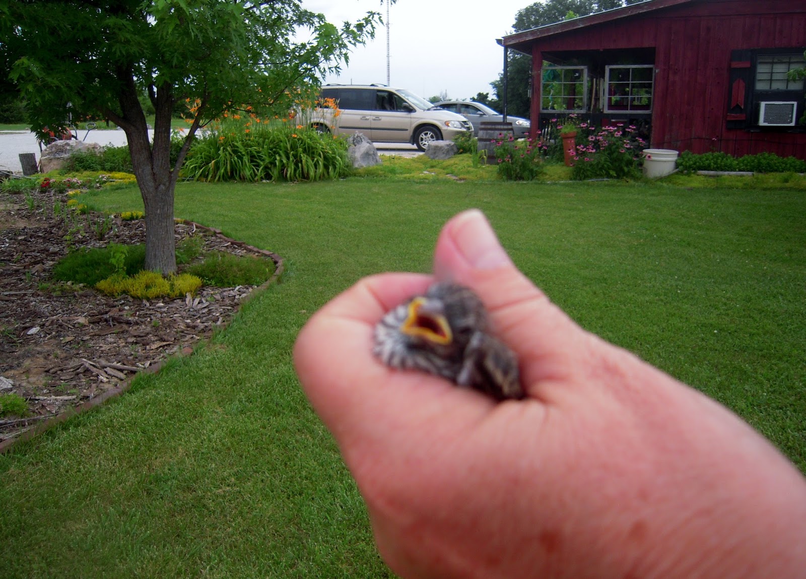 I caught the little bird. He is not much bigger than my thumb, a mere appetizer for Martha, the boy cat. I tried to put him back in his nest, but he half-flew to the ground again. I hope Martha ate a good amount of cat food before he went out tonight.